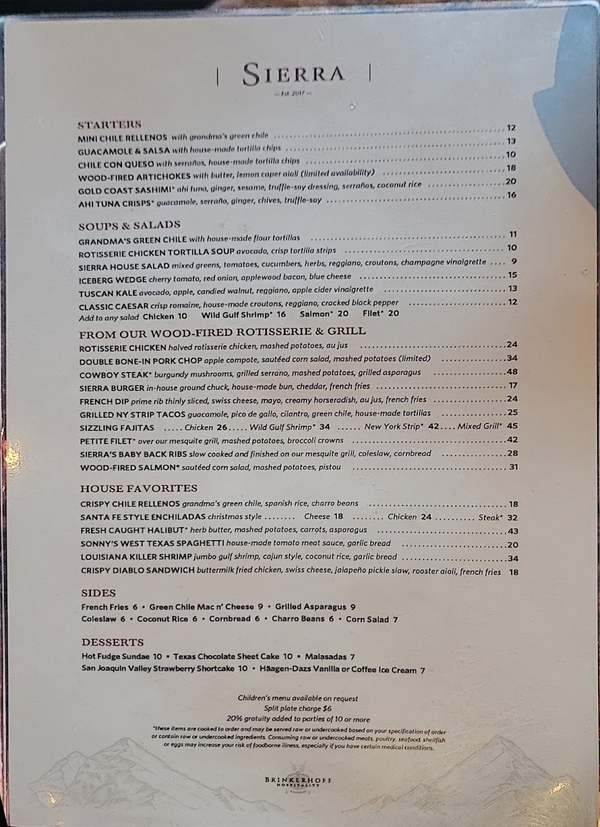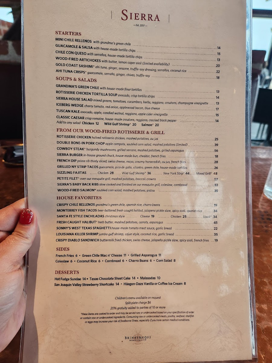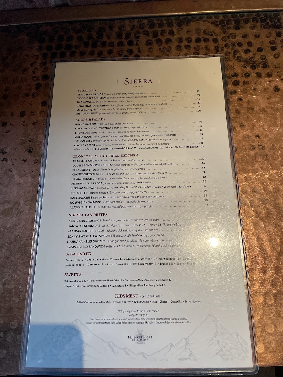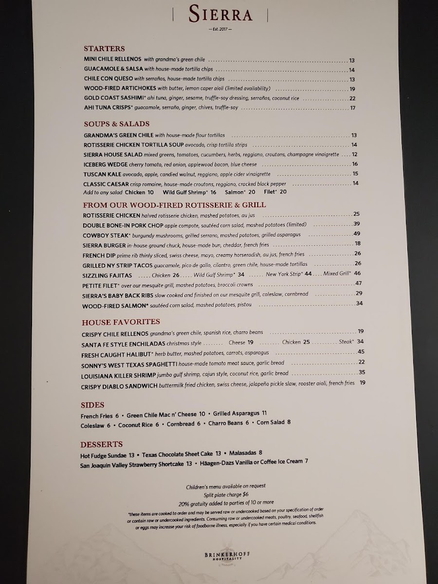 We have visited Sierra twice now and have had a pleasurable meal both times. The restaurant is perched on a hill and provides nice views of the area. The dinning area is comfortable and large enough so that you do not feel like you are sitting too close to other guests. On the appetizers, we have tried the Ahi Tuna Crisps and the Mini Chile Rellenos. I would recommend both of these options, but the Chile Rellenos are a favorite because they come with a little side of their green chile which I think is pretty delicious. For entree's I have tried the Crispy Diablo Chicken Sandwich and the Louisiana Killer Shrimp. The chicken sandwich was good and the chicken breast was not to thick, creating a good ballance of flavor. The Louisiana Killer Shrimp were also tasty with lots of bold flavors, probably my favorite of the two. Sierra is known for the wood fired grill, but I have not really tried anything that is prepared in that way. I have also had the wedge salad which was delicious and their dressing hit the spot. Our service at Sierra has alway been top notch.