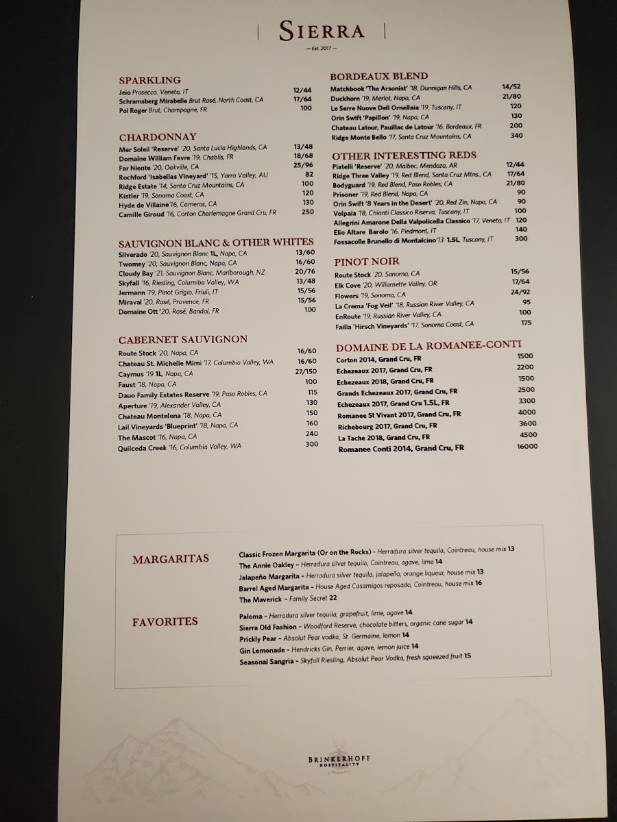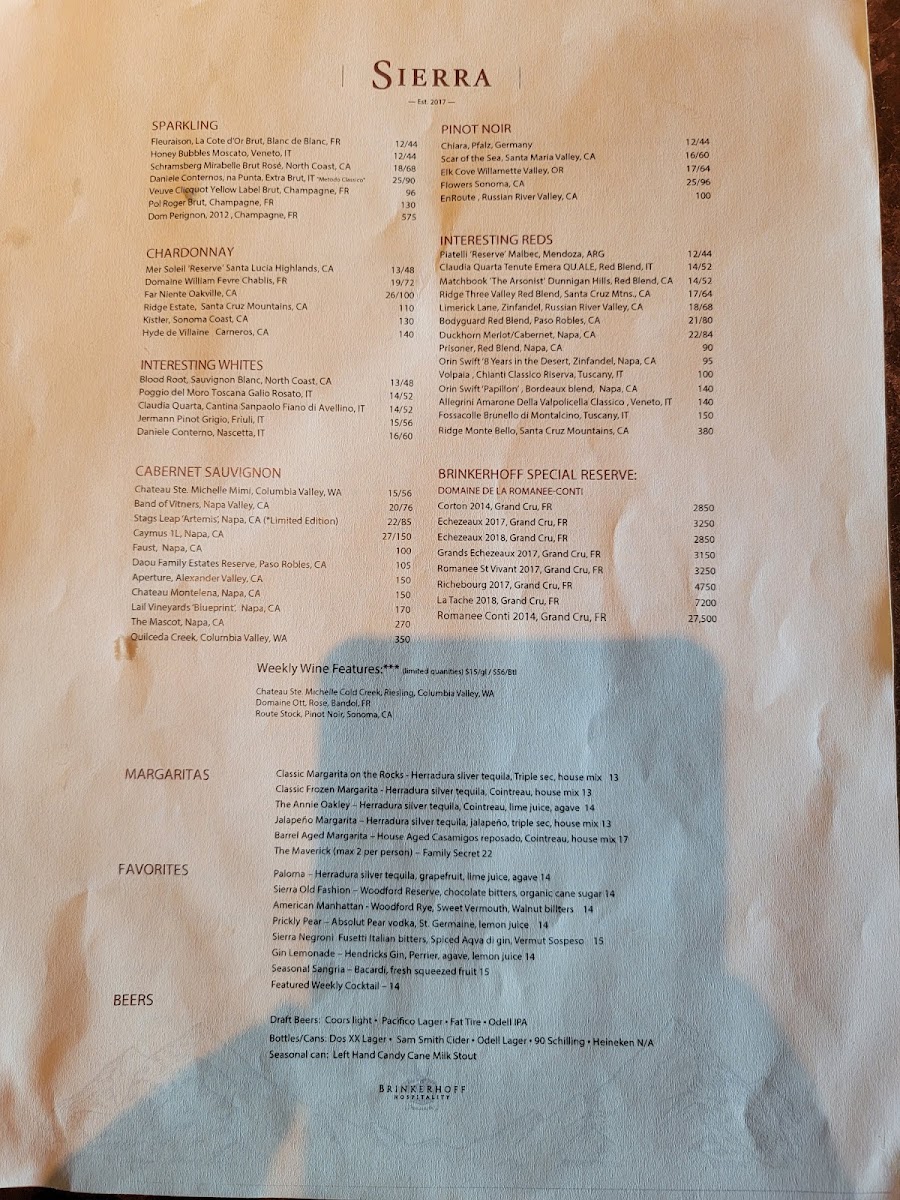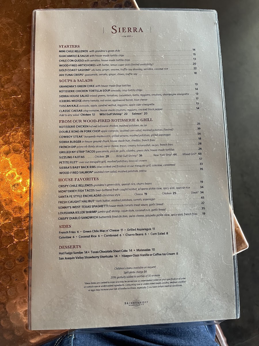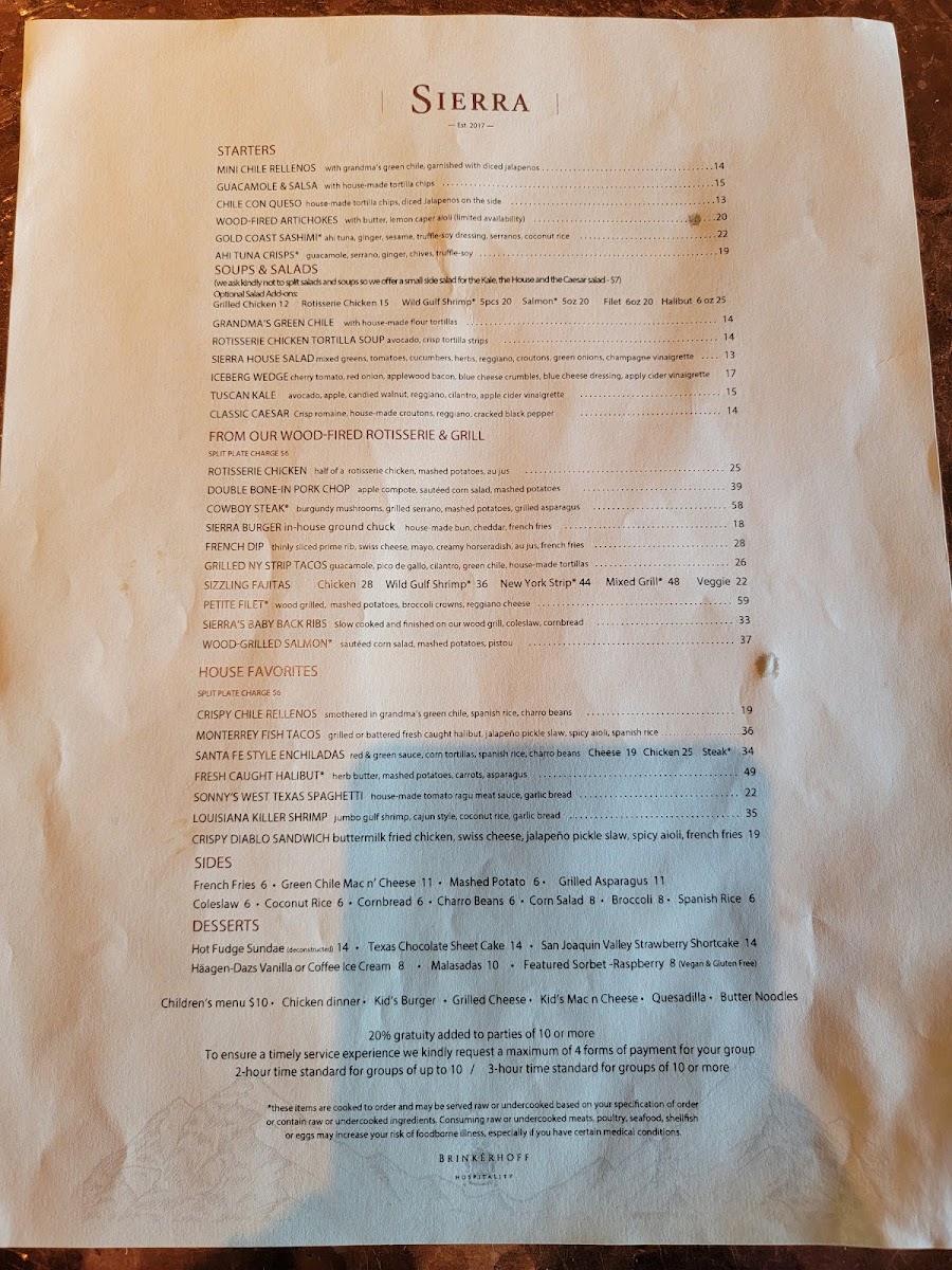 We have visited Sierra twice now and have had a pleasurable meal both times. The restaurant is perched on a hill and provides nice views of the area. The dinning area is comfortable and large enough so that you do not feel like you are sitting too close to other guests. On the appetizers, we have tried the Ahi Tuna Crisps and the Mini Chile Rellenos. I would recommend both of these options, but the Chile Rellenos are a favorite because they come with a little side of their green chile which I think is pretty delicious. For entree's I have tried the Crispy Diablo Chicken Sandwich and the Louisiana Killer Shrimp. The chicken sandwich was good and the chicken breast was not to thick, creating a good ballance of flavor. The Louisiana Killer Shrimp were also tasty with lots of bold flavors, probably my favorite of the two. Sierra is known for the wood fired grill, but I have not really tried anything that is prepared in that way. I have also had the wedge salad which was delicious and their dressing hit the spot. Our service at Sierra has alway been top notch.